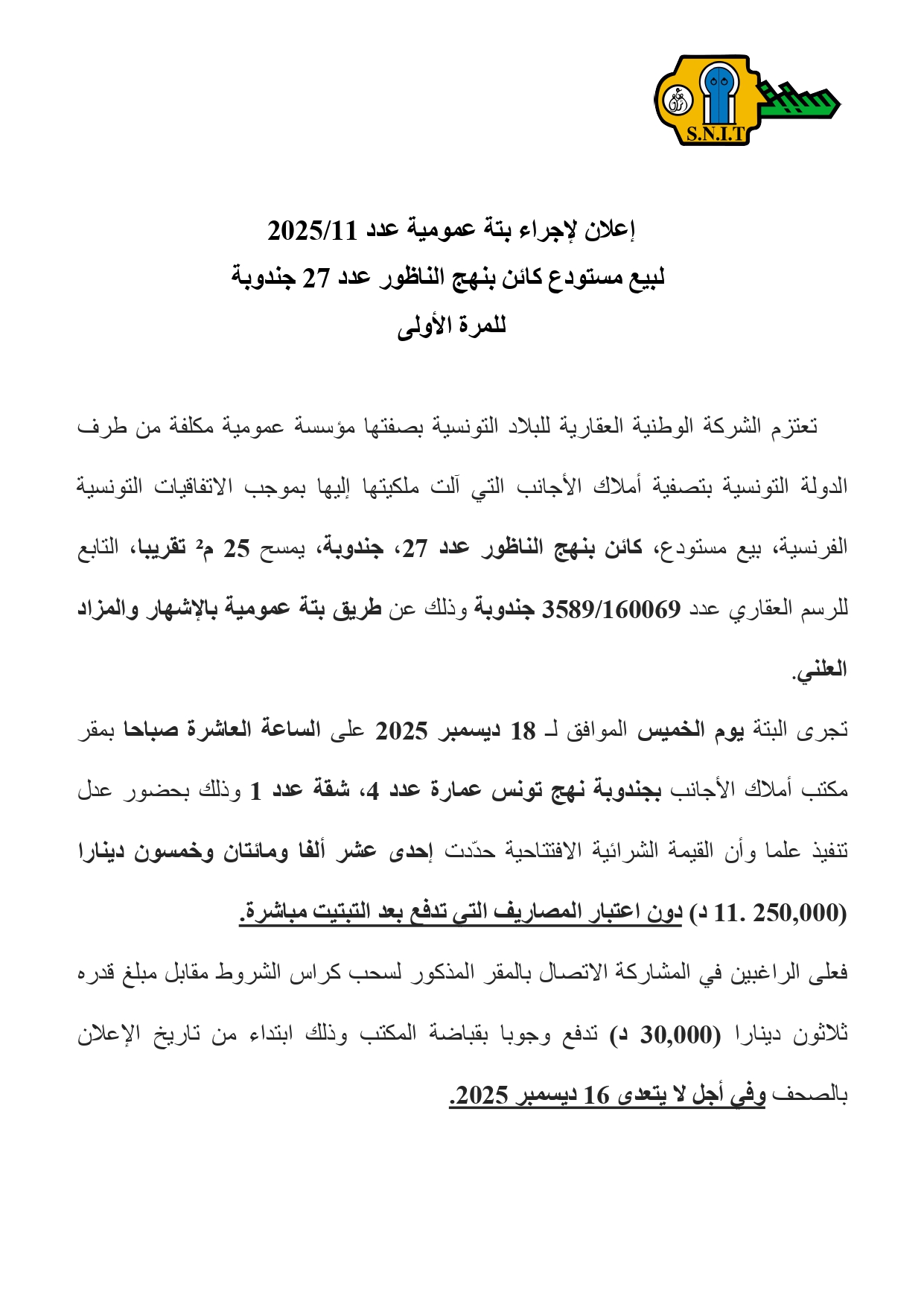 إعلان عن بيع مستودع عن طريق بتّة عمومية بالإشهار والمزاد العلني عدد 11/2025